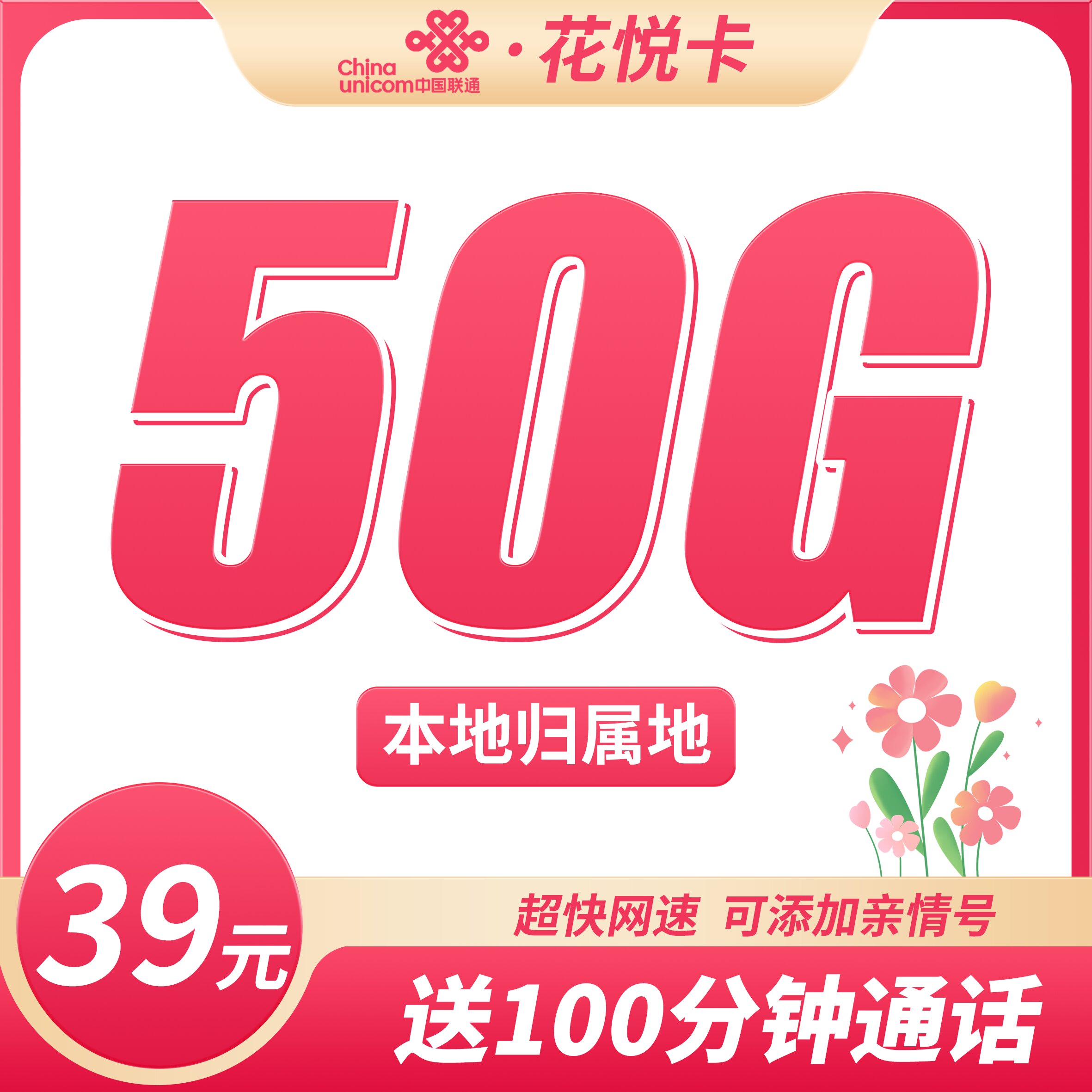联通花悦卡39元50G+100分钟+本地归属地!套餐构成首月39元按天折算,次月起39元/月到账20G通用+30G专属流量+100分钟归属地本地不发地区山东,天津,云南文山州,新疆等地不发货,具体以运营商审核为准配送方式工作人员上门激活方式工作人员激活首充渠道任意渠道一次性充值50元办理年龄18-60岁违停复机-套餐合约12个月合约注销方式支持异地注销、营业厅注销,合约期内注销有违约金,违约金=(原套餐月租-当前月租)×已履约月份,如有变动以官方为准